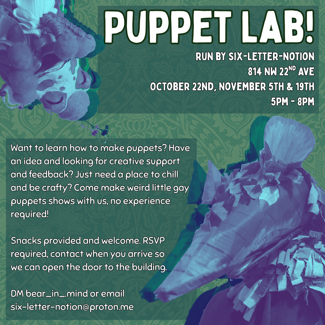 Want to learn how to make puppets? Have an idea and looking for creative support and feedback? Just need a place to chill and be crafty? Come make weird little gay puppets shows with us, no experience required!