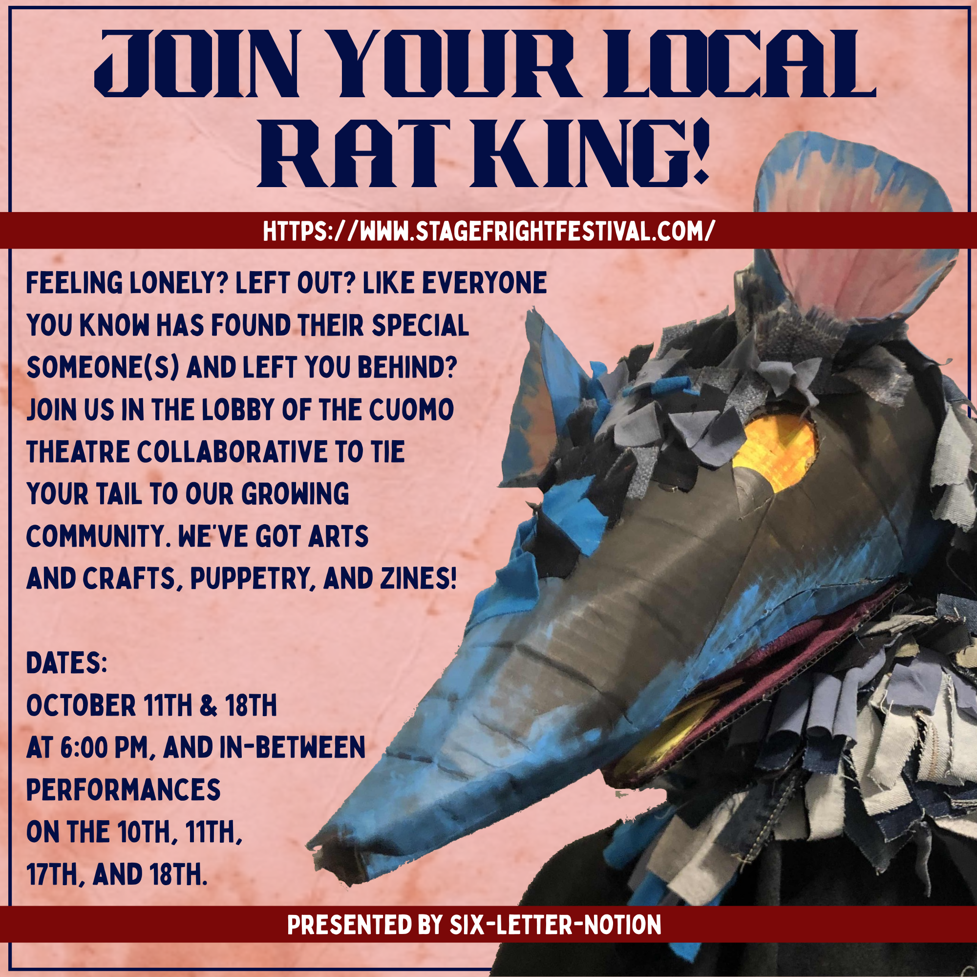 Join the rat king at Stage Fright this year! One of the many pieces of performance art & installations, happening on October 11th and 18th at 6:00 PM, and next door in the lobby of the Cuomo Theatre Collaborative in between performances on the 10th, 11th, 17th and 18th. No ticket required for entry.