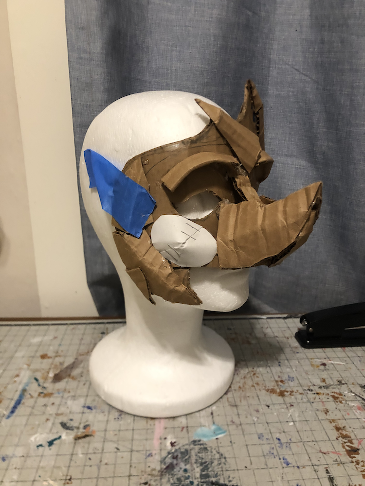My friend Adam at Jawbone Puppet theater has a philosophy for mask and puppet making he's focused on later in his career, to focus on what can be done as simply and quickly as possible to get the point across and focus more on the performance than detailed puppets. A similar, even more strict philosophy shared by Tim Giugni, who goes a step further is using entirely found objects and puppets made so quickly he can make them new every performance. I'm using a bit of that energy here, just getting the simplest shapes figured out with cardboard strips and a stapler before slapping on one-and-a-half layers of paper mache. I'm also a little tired of looking through black fabric, so to prove my own philosophy on the suspension of disbelief, all the eye-holes on these pieces will be open.