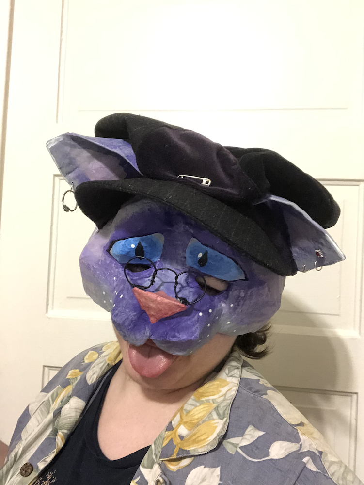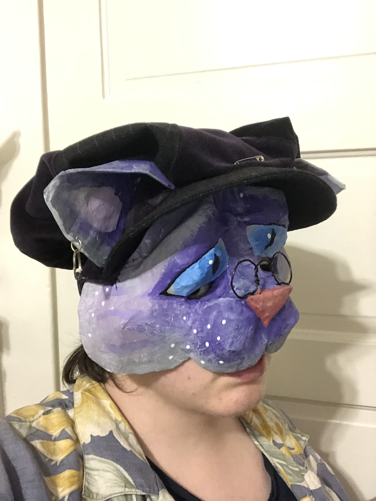 The cat here is based more on Basilio from the Russian Buratino, since I find his design more distinct than the Pinocchio version of the cat. I wanted him to have large, droppy cheeks and a wide face. The hat in the photos was a scrapped project, not lined yet, so I didn't mind cutting holes for the ears, and it gives him a lot of character to base the design off of. It also serves as the elastic to keep the mask on.