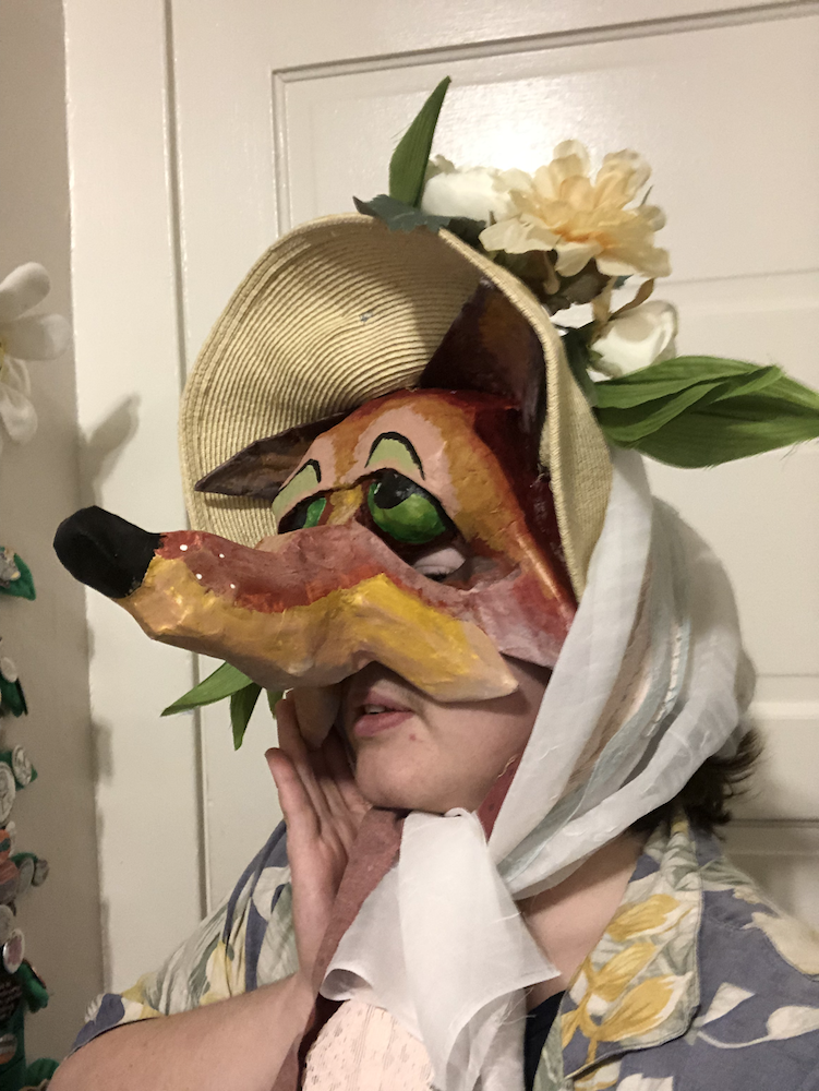 In the meantime, they're getting hats! For the Fox, I found a large-brimmed staw hat at the thrift store (yes, in November) and cut the brim off. My plan was to give her a sort of bonnet with a ribbon around the chin that would hold it and the mask in place. I had to cut a bit of cardboard off the top of the mask, but I eventually got everything to fit and simply hot glued the brim of the hat to the head and backs of the ears.