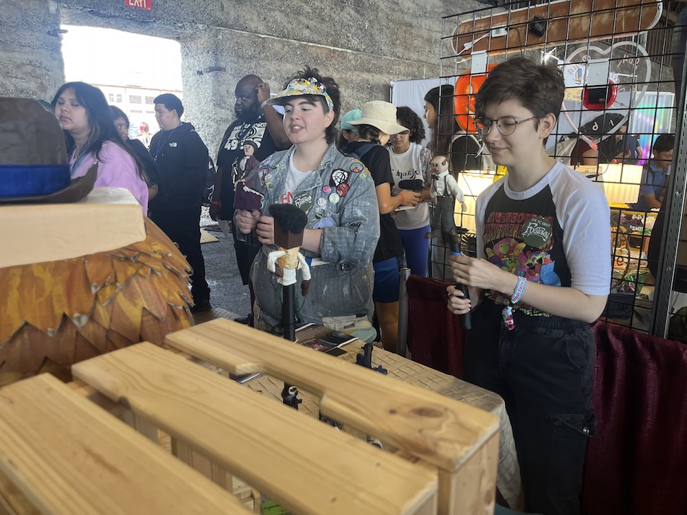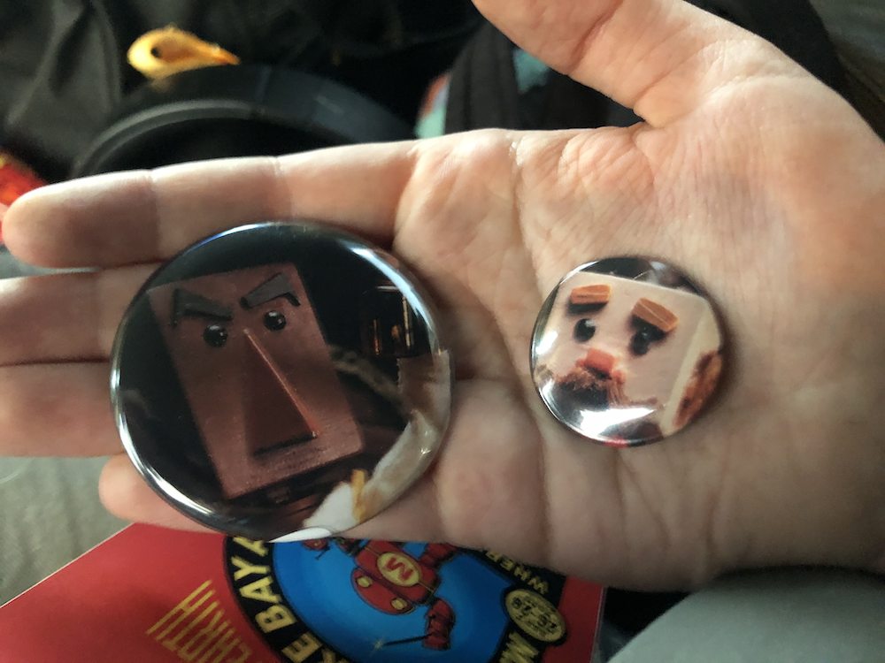 Next to Chomp Saw was a local kid's maker space with a chicken robot that dispensed fortunes based on old automaton designs. Since we were so close, we were at each others' booths often, and I even made some Fogtown pins using their pin-making setup.