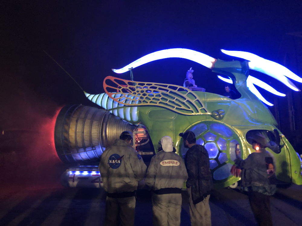 Near the end of the night, we wandered over to the giant art car - which we had been calling the bug car - to have a turn onboard with all the lights and effects playing. As son as we sat down though, we noticed all the crew climbing on board - and soon we were moving! The bug car was heading back to its spot on the midway for the faire the next day. We got spirited away by the bug car! Waving to passersby from the second floor like a parade float.