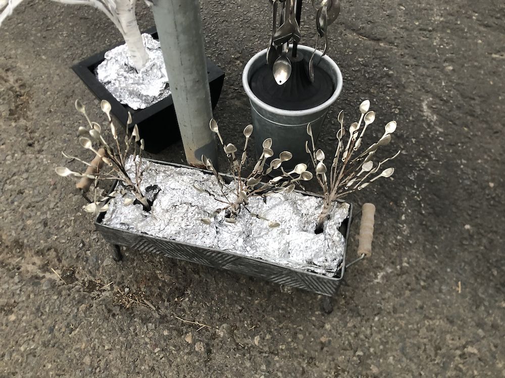 Back at where the Maker Mixer had been the night before, we got to properly experience the Spoon House in the daytime. The Spoon House is, as it sounds, a house made of curtains of linked spoons. It's filled with spoon furniture, spoon plants, and even spoon reading material.